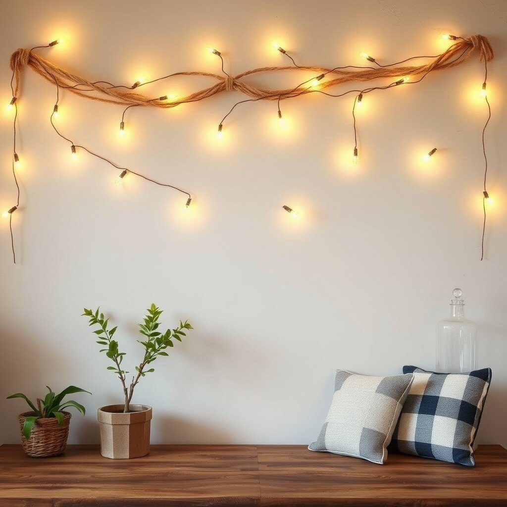 Combine string lights with twine for a rustic look on your wall. This works well in spaces with a farmhouse or country-style décor.