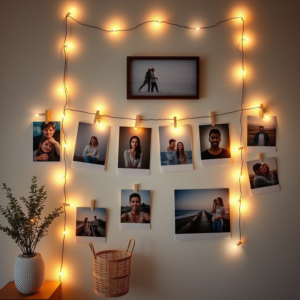 String lights across a wall and use them to display nostalgic photos. This idea turns memories into a warm, glowing display.