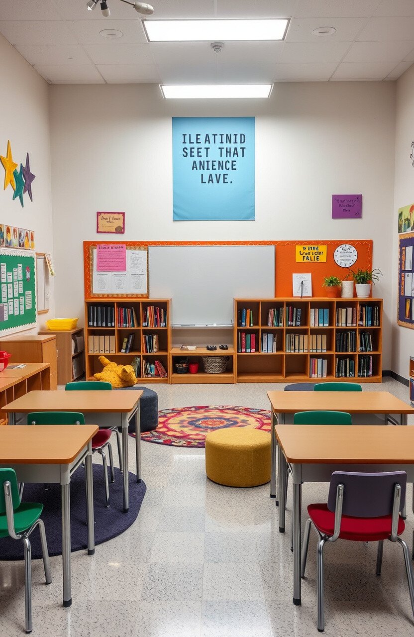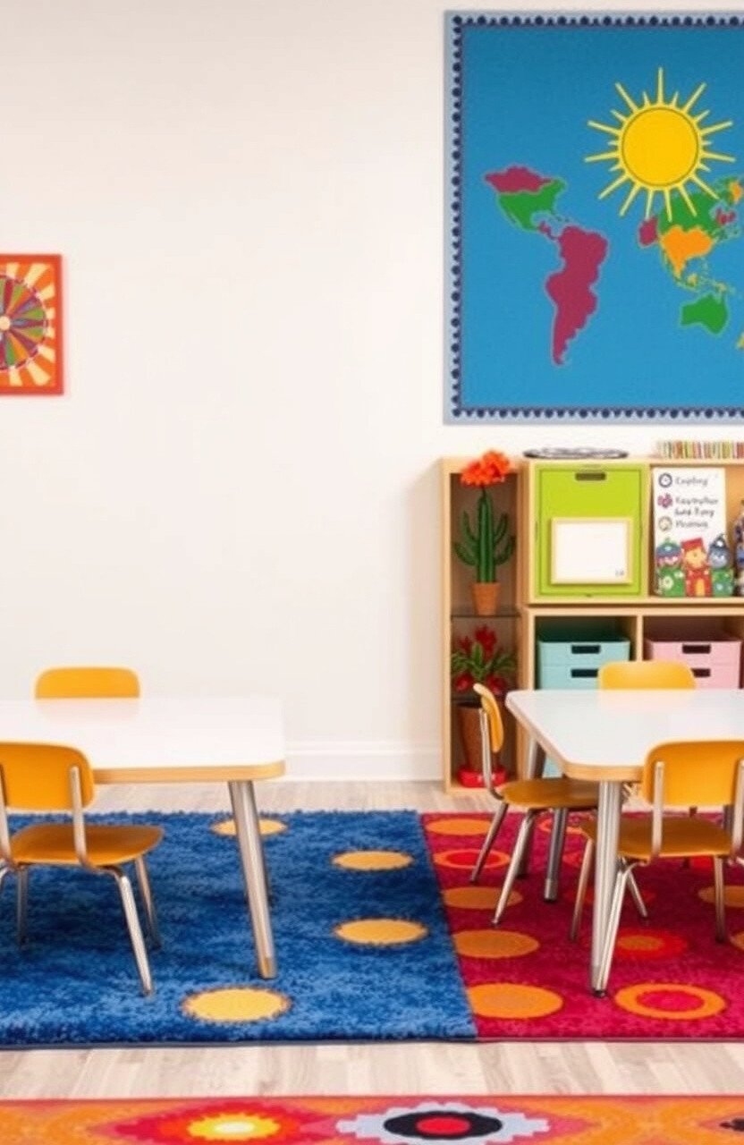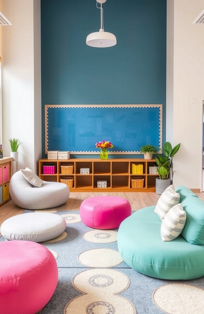 Use rugs to designate zones like reading areas or group work spots. Choose bright patterns that inspire creativity.