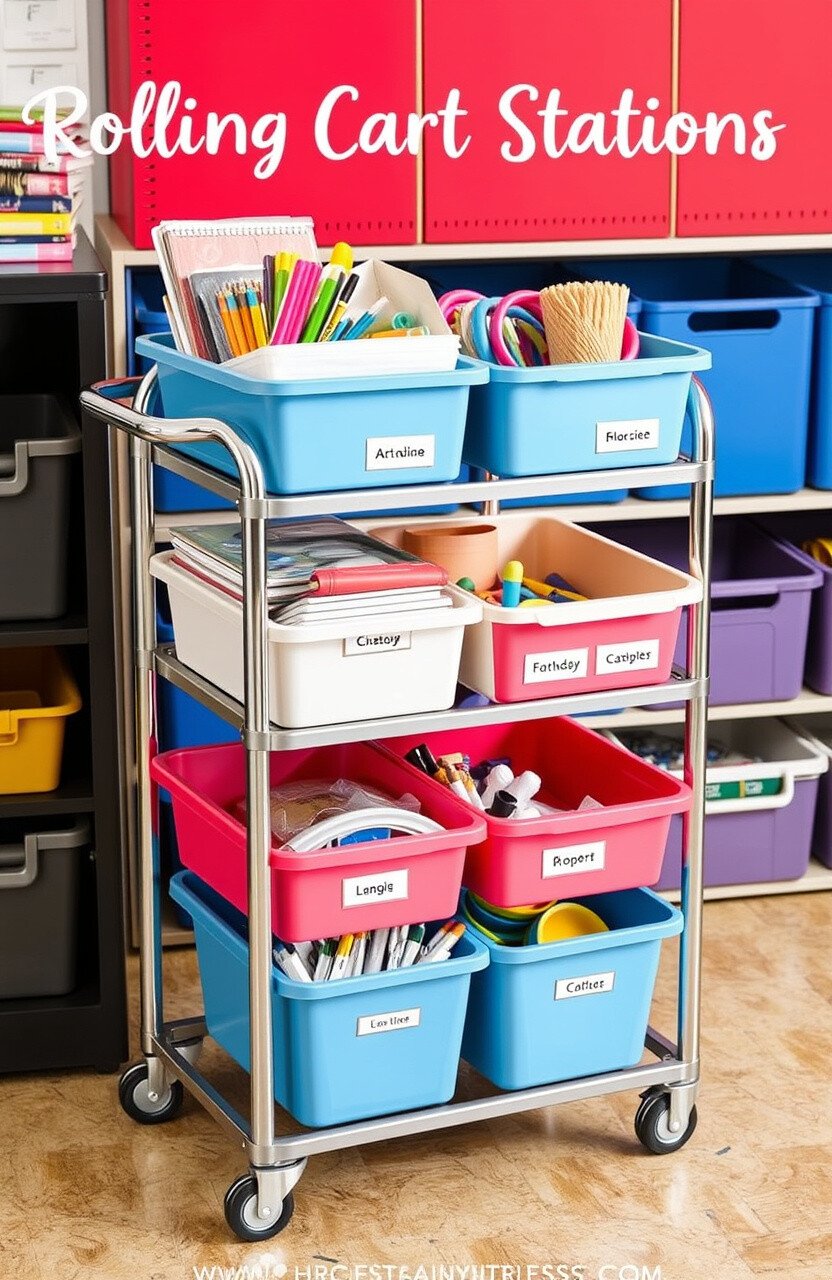 3. Rolling Cart Stations A rolling cart can be a mobile command center for teachers. Load it with supplies, and roll it wherever needed.
