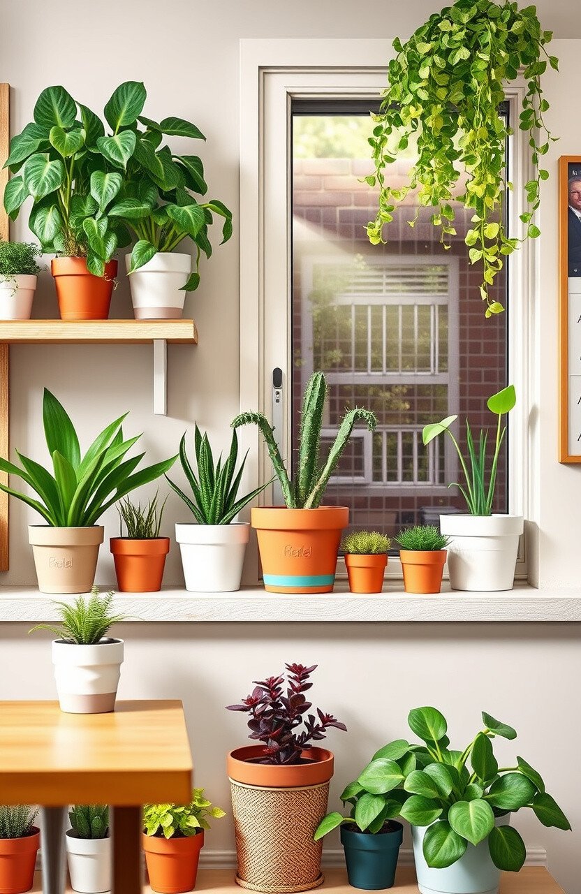 Choose low-maintenance plants like succulents. Display on shelves or window sills.