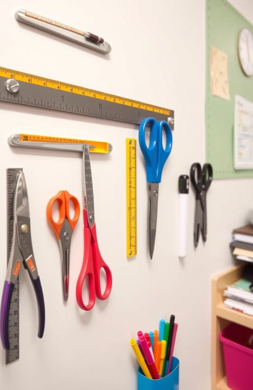 2. Magnetic Wall Strips Keep important tools like scissors and rulers within reach using magnetic strips. This makes grabbing what you need quick and easy.