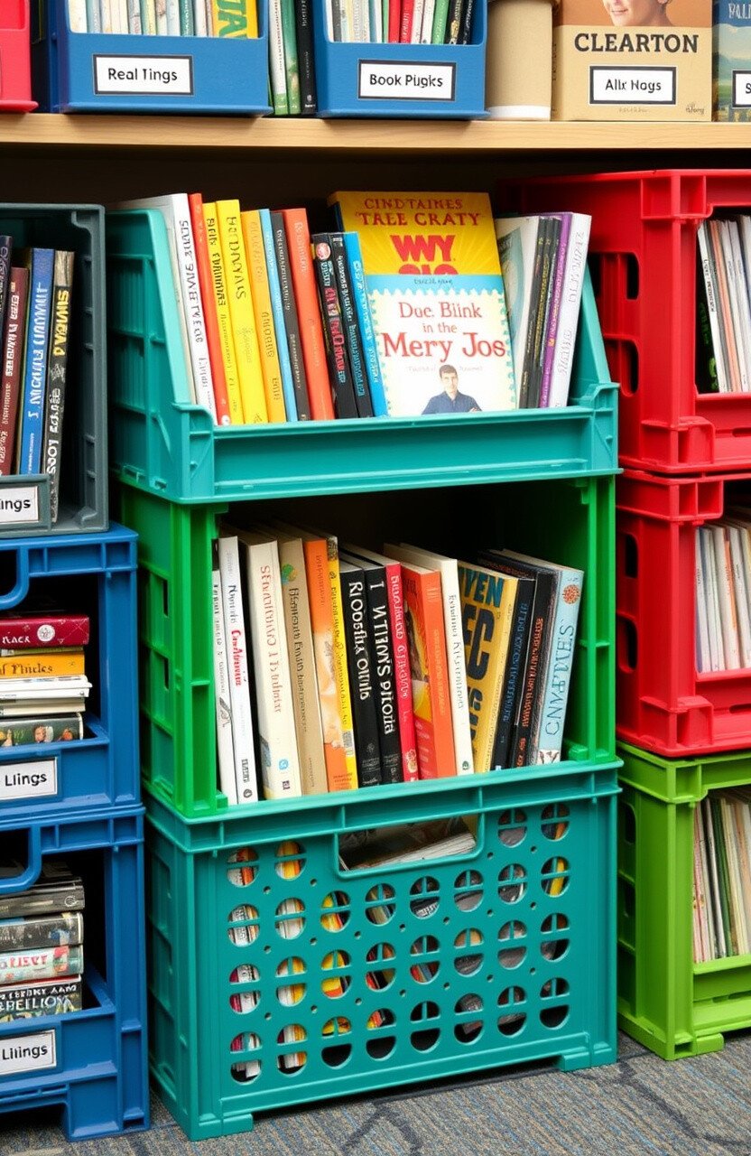 12. Classroom Library Crates Organize books in sturdy crates for an accessible classroom library. Students can easily browse and choose books.
