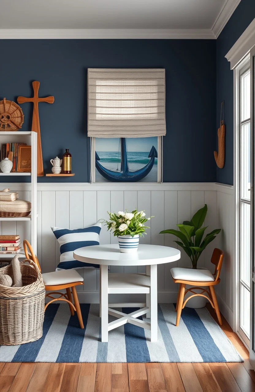 Use navy and white stripes and coastal decor for a nautical feel. Natural materials and simple furniture add to the look.
