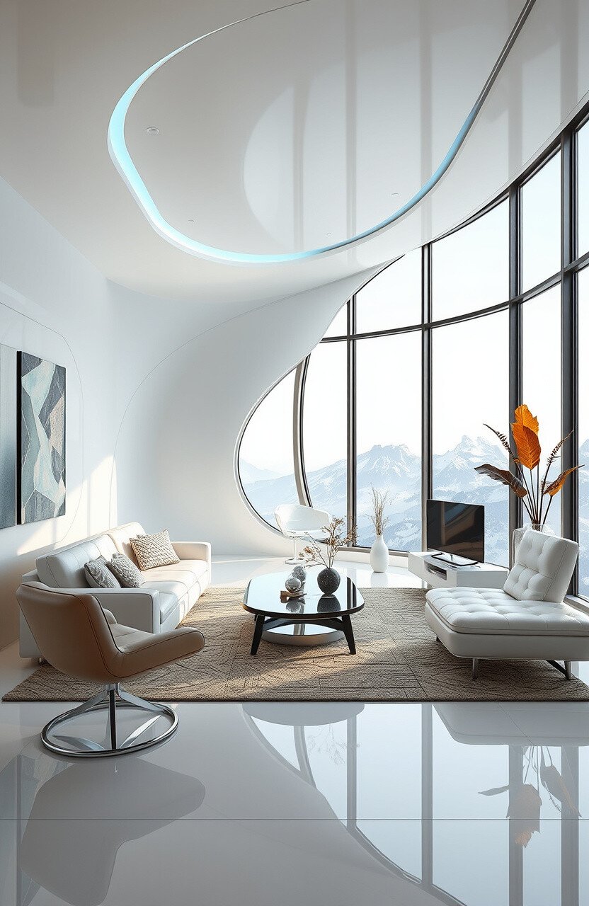 Use metallic finishes and innovative furniture for a futuristic feel. Neutral colors and clean lines add to the look.