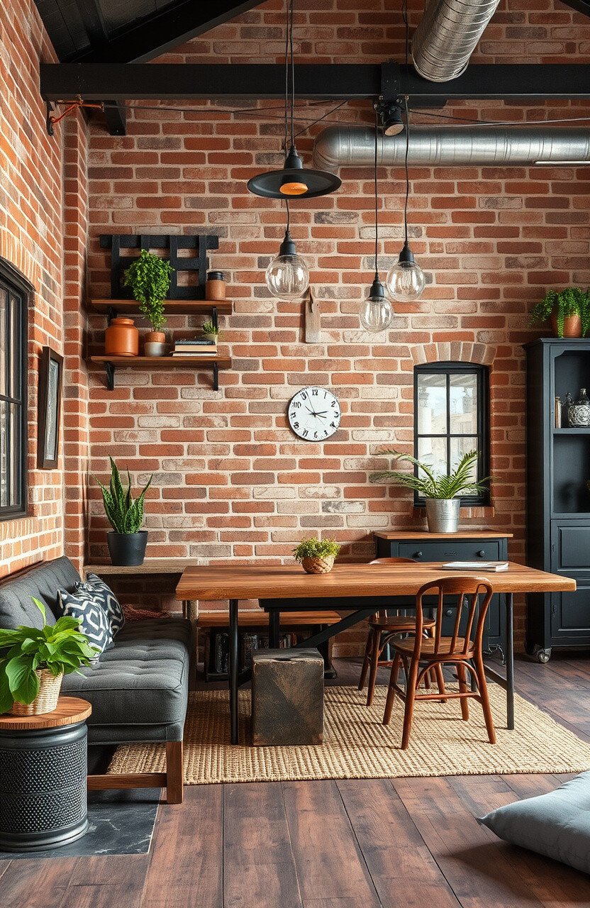 Use exposed brick and metal finishes for a rustic industrial feel. Natural materials and simple furniture add to the look.