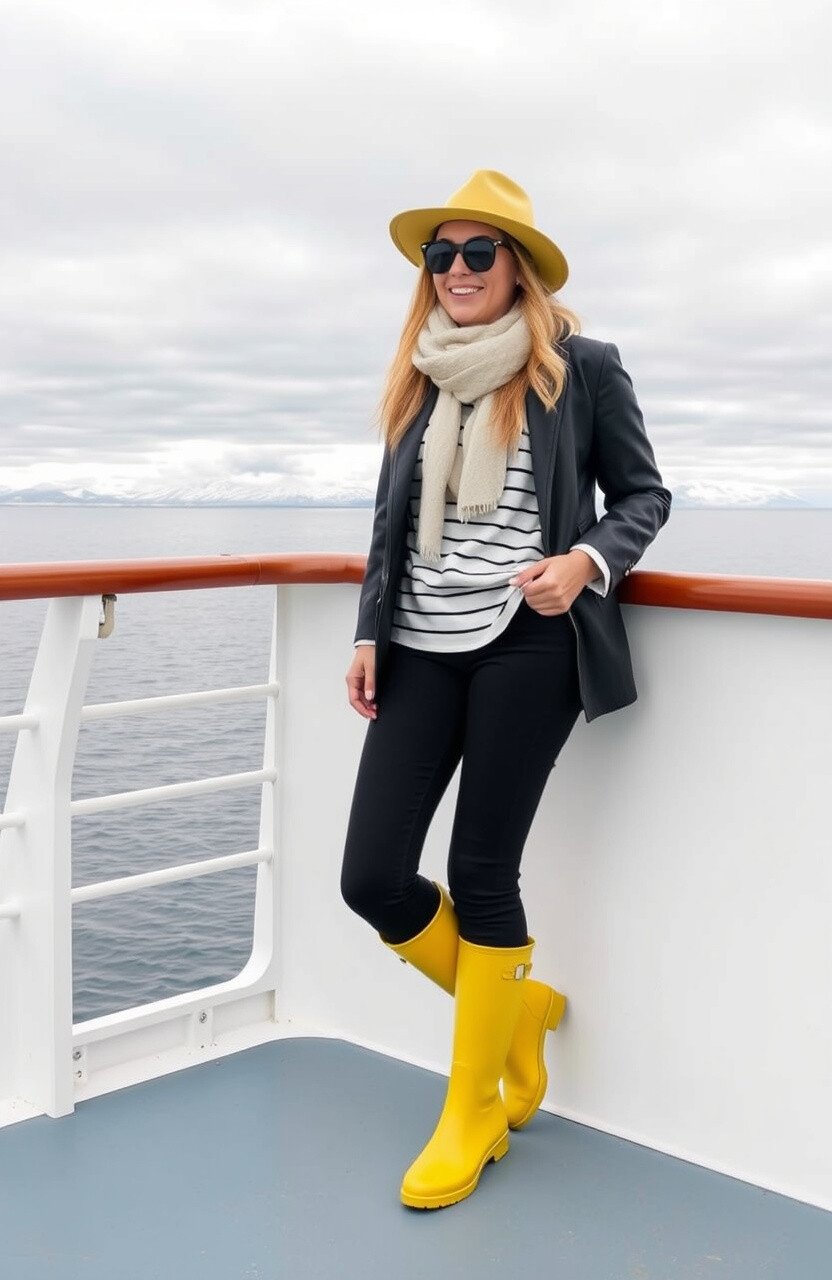 Yellow boots are like a ray of sunshine on a cloudy day. They bring a cheerful vibe to any outfit, perfect for brightening up the gray days at sea. Pair them with a monochrome outfit to let the boots be the star.
