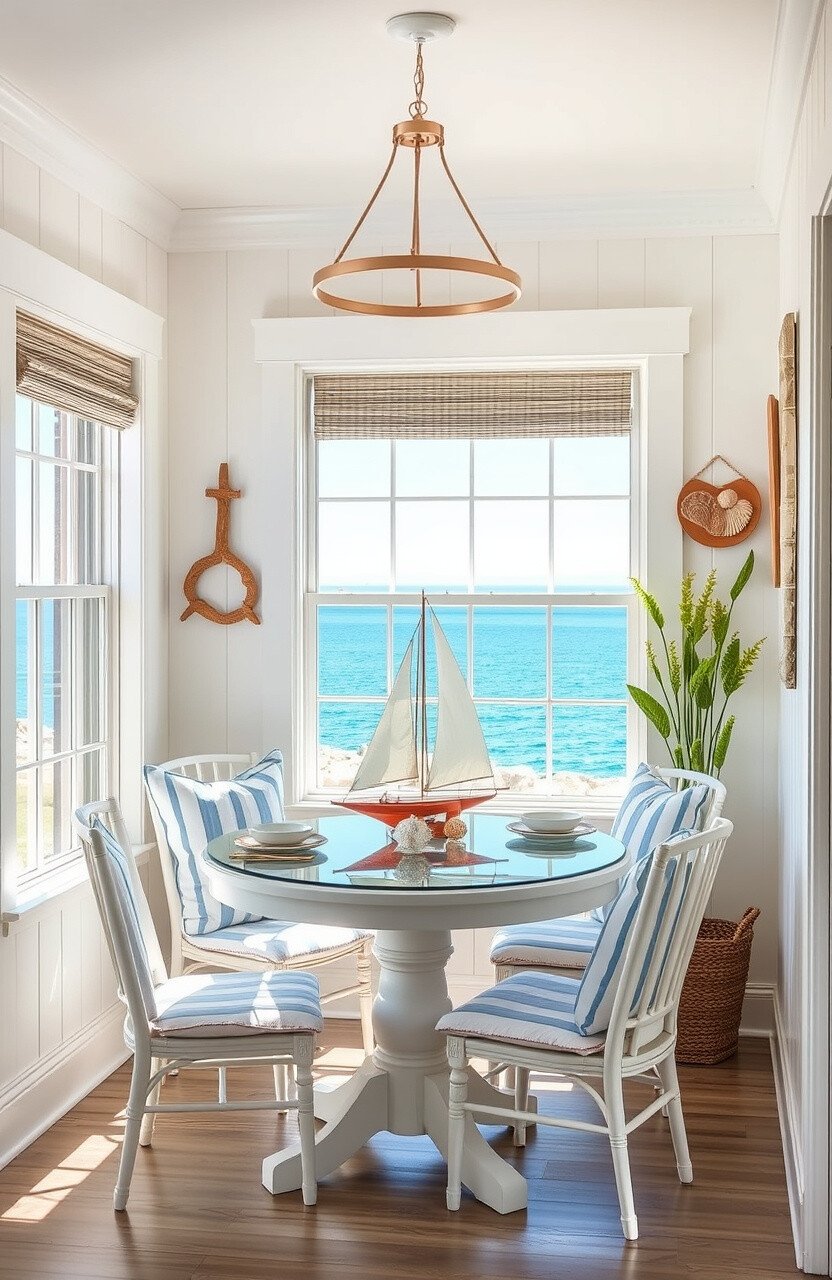 Create a seaside-themed dining area near a sunny window. Use light colors and nautical decor for a beachy vibe.