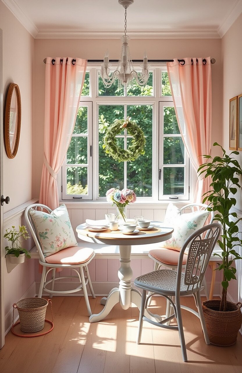 DIY projects and thrifted items keep costs low. This nook is perfect for those who love a gentle, pastel palette.