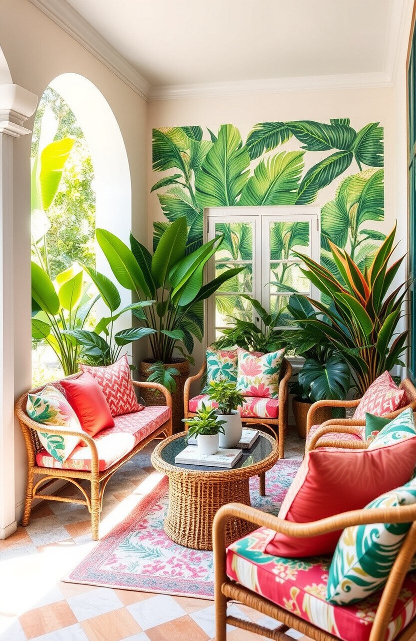 This idea is unique because it brings the tropics home. Use palm leaf patterns, rattan furniture, and bright cushions.