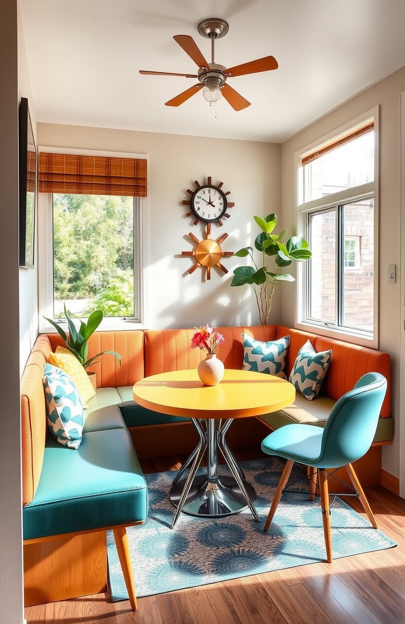 Incorporate a sunburst clock or atomic art for extra style. It’s a space that makes breakfast feel like a design classic.