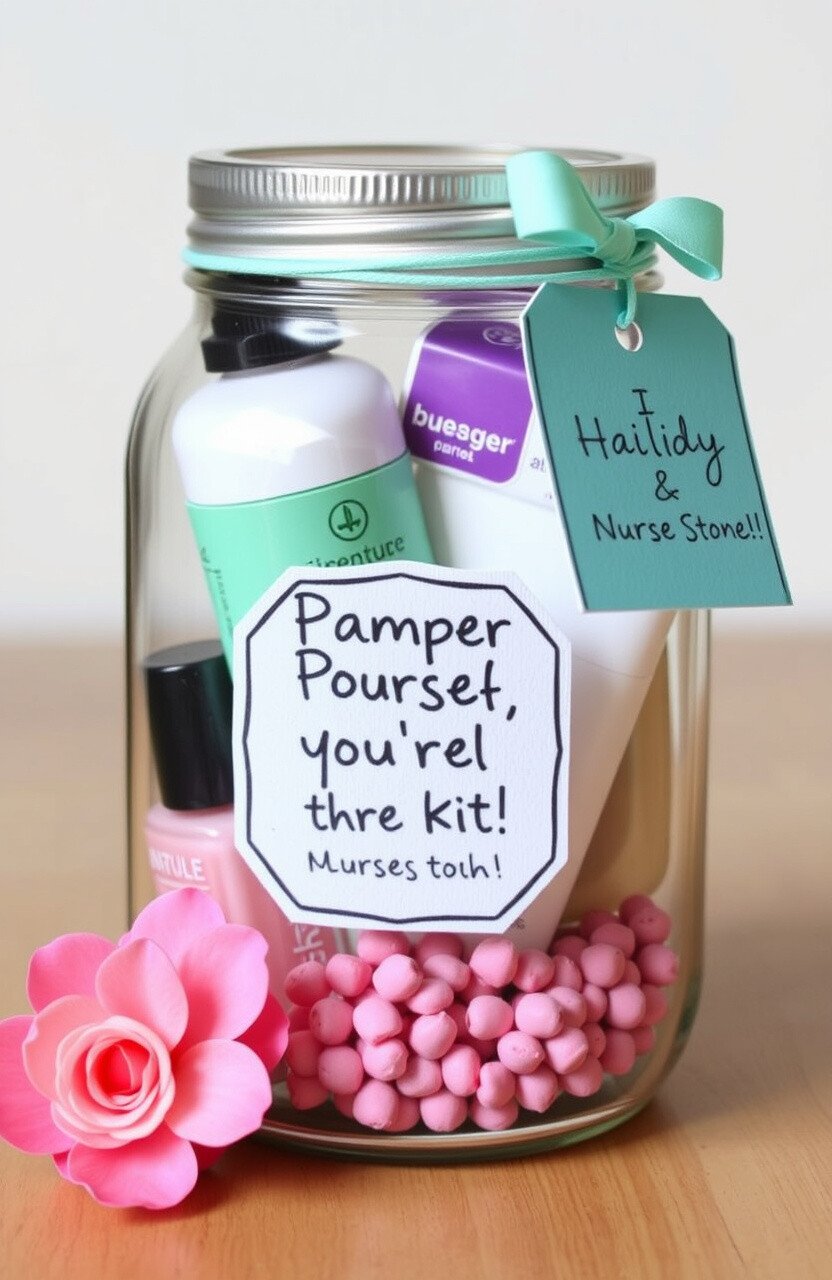 Fill a jar with soothing items like lavender-scented candles, herbal teas, and calming bath salts. This jar is perfect for nurses who need a moment of relaxation after a long shift.
