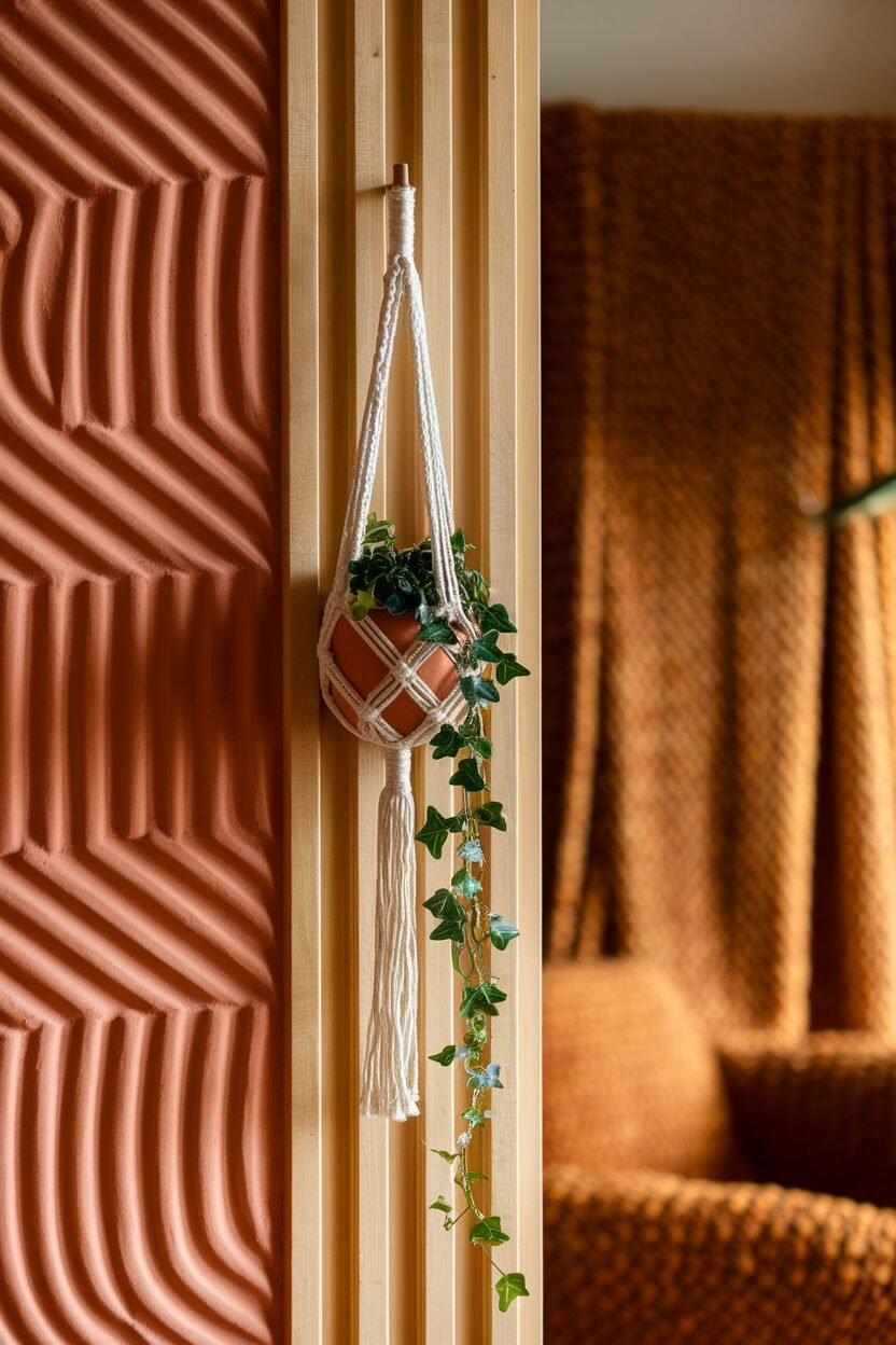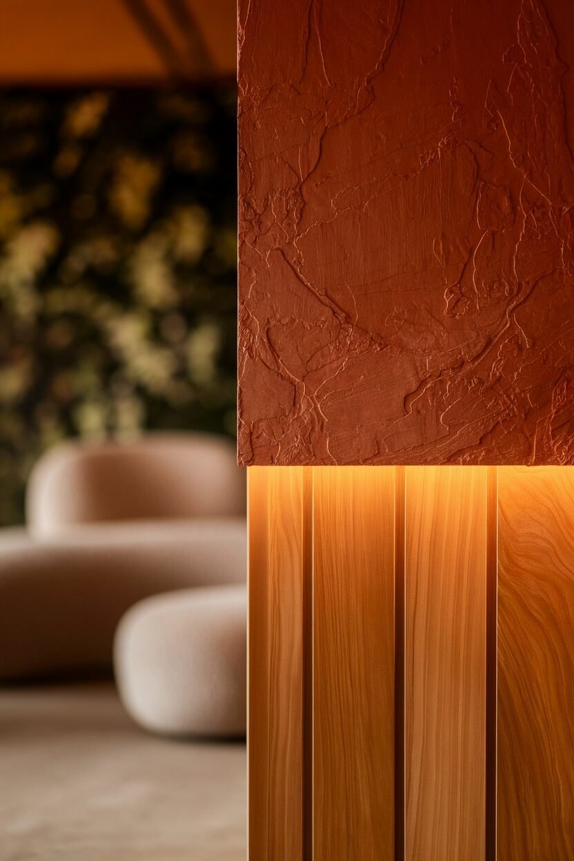 This style is unique because it combines modern design with natural elements. The clean lines of the wood paneling contrast beautifully with the rich hue of the terracotta. You can accentuate this look with modern furniture and accessories that echo the simplicity of the design.