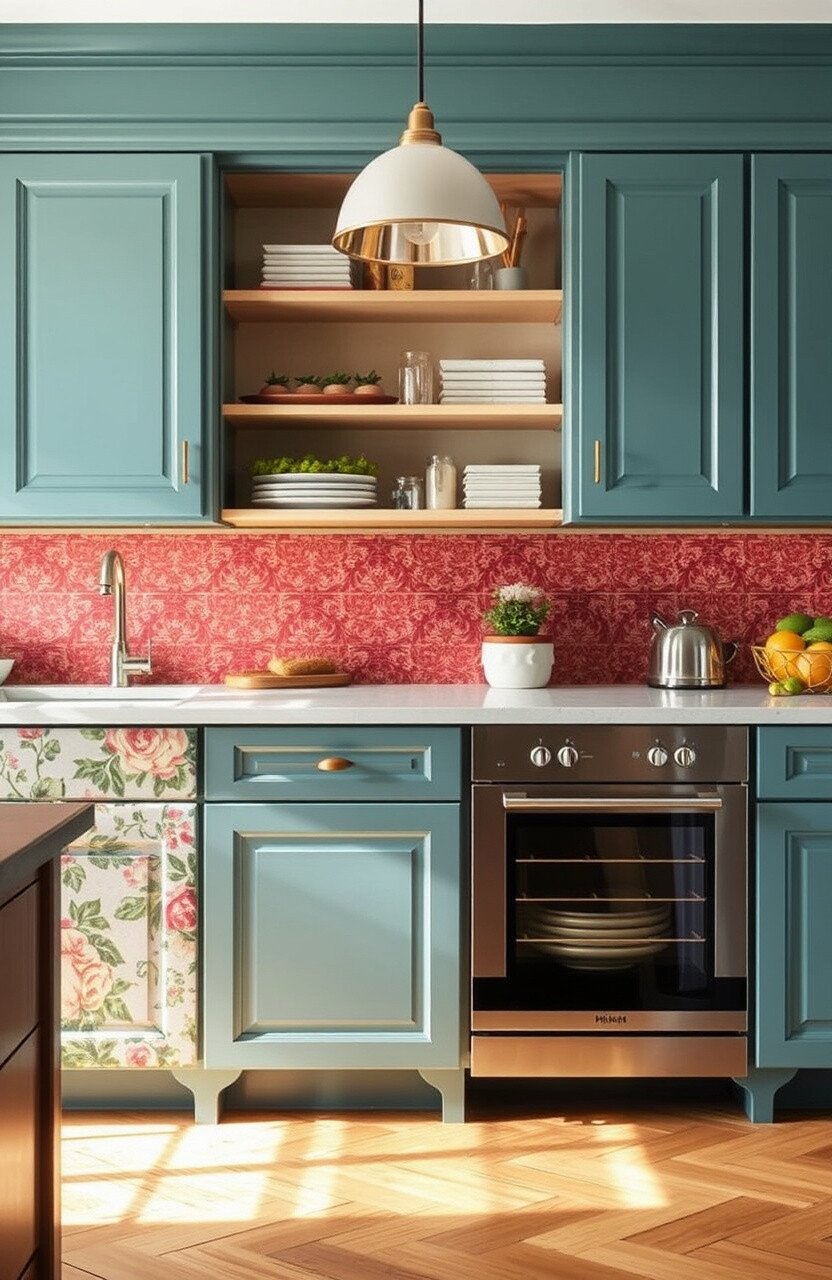 Pair with simple, neutral walls to keep the focus on the cabinets. This balances the busy patterns.