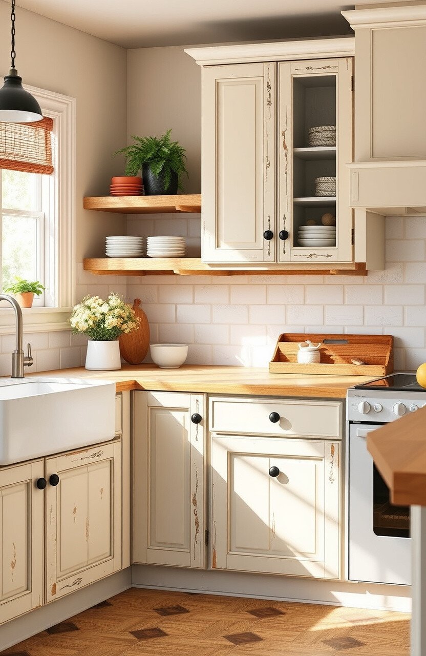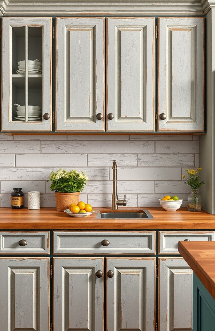 Distressed cabinets add character and a lived-in feel. They’re perfect for a rustic or farmhouse style kitchen.