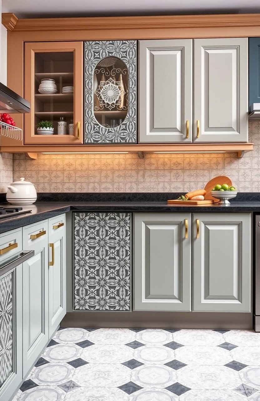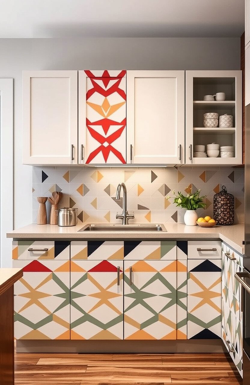 Geometric patterns on cabinets add a fun and artistic element. Think bold shapes and colorful designs.