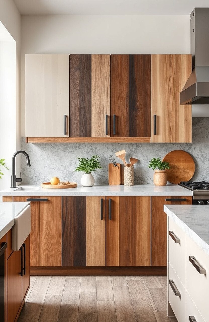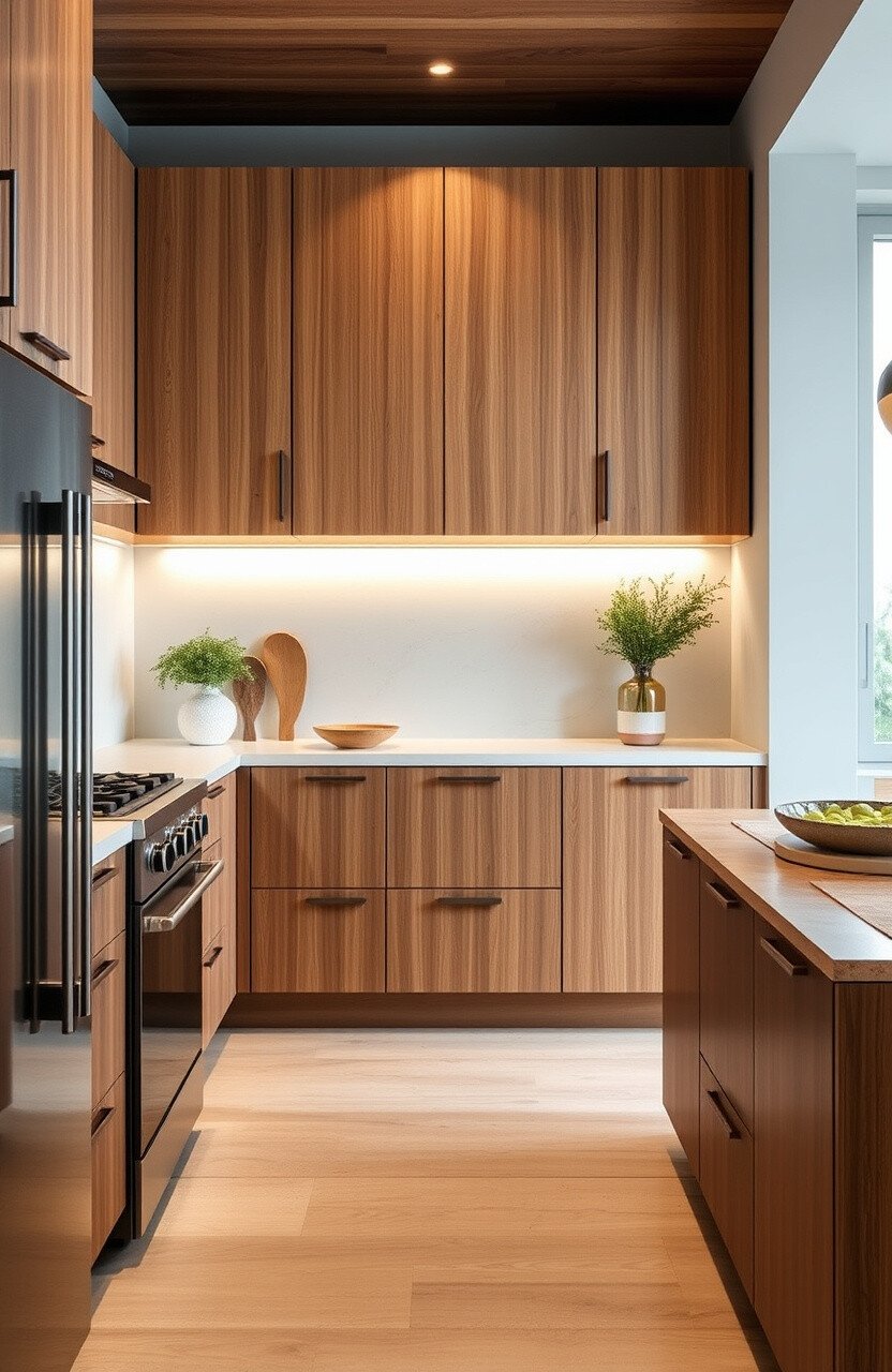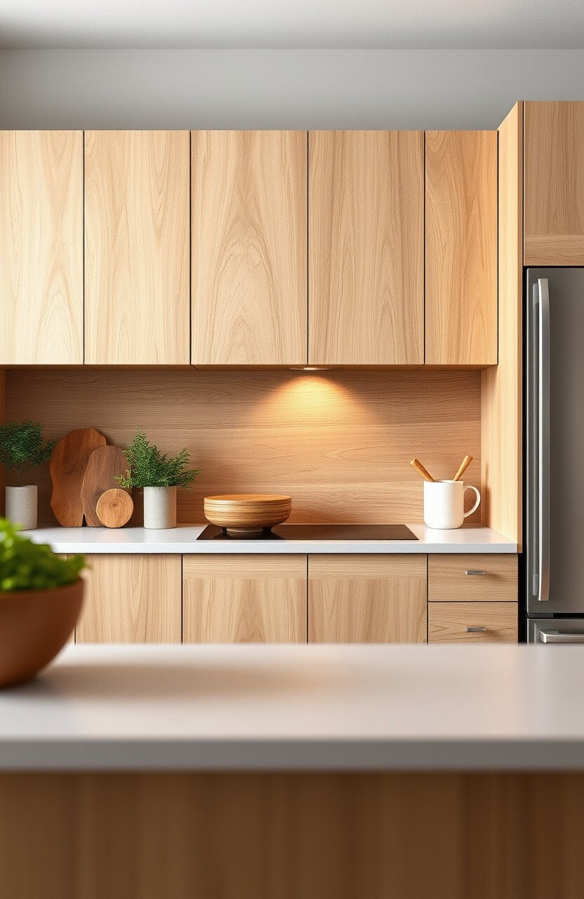 Natural wood grain cabinets add warmth and texture. They’re perfect for creating a cozy and inviting kitchen.