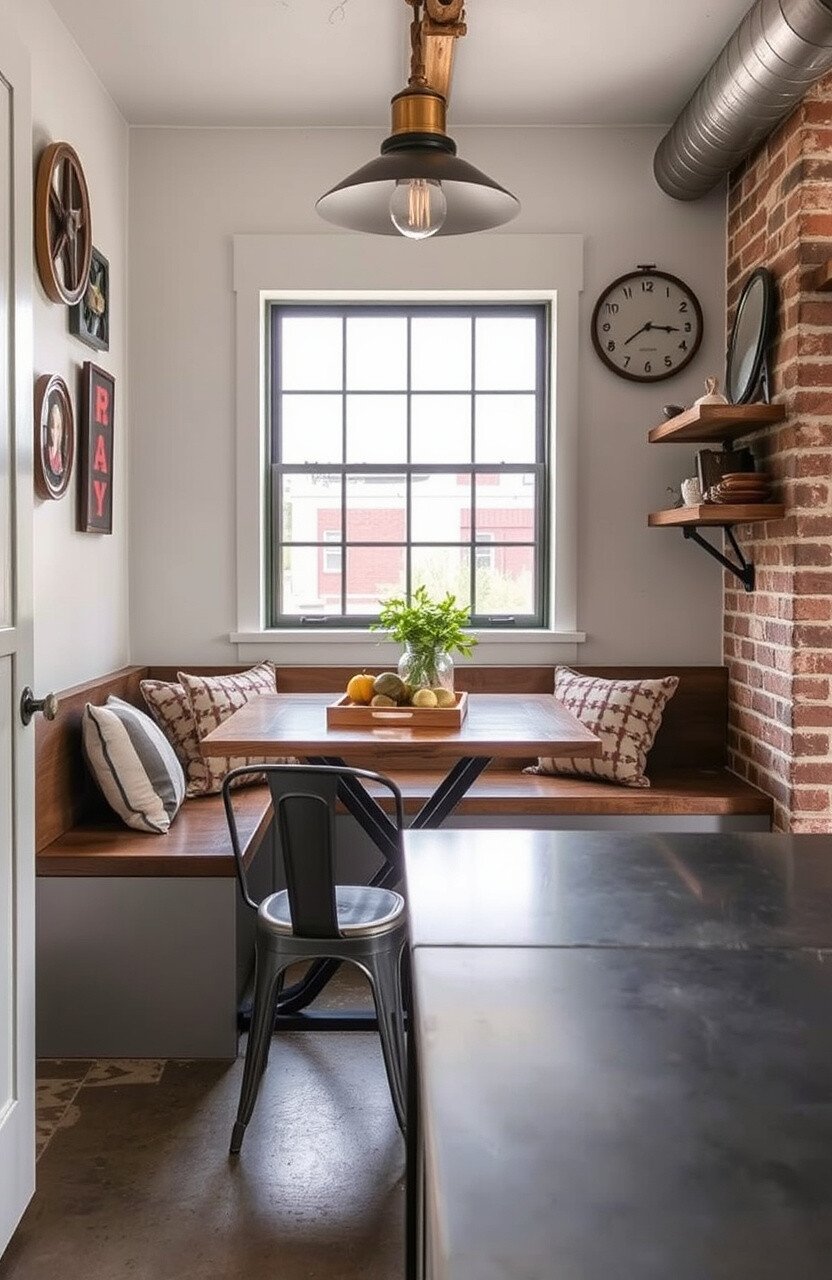 Consider adding exposed brick for extra character. A metal table can enhance the industrial vibe.