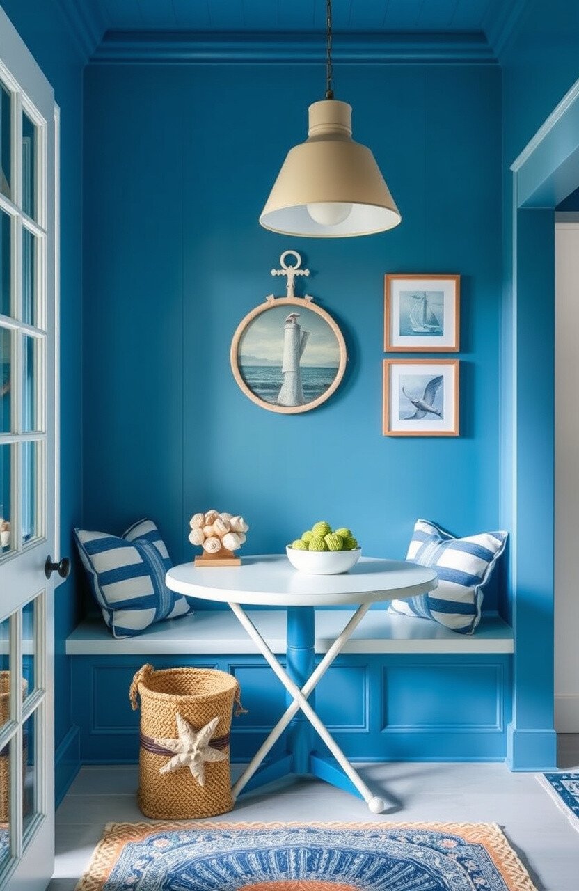 Blue hues and seaside decor bring the ocean to you. It’s perfect for a coastal-inspired kitchen nook.