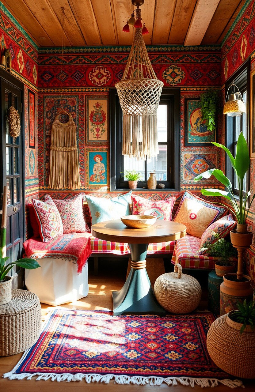 Eclectic patterns and vibrant colors create a lively atmosphere. It’s perfect for those who love global-inspired decor.
