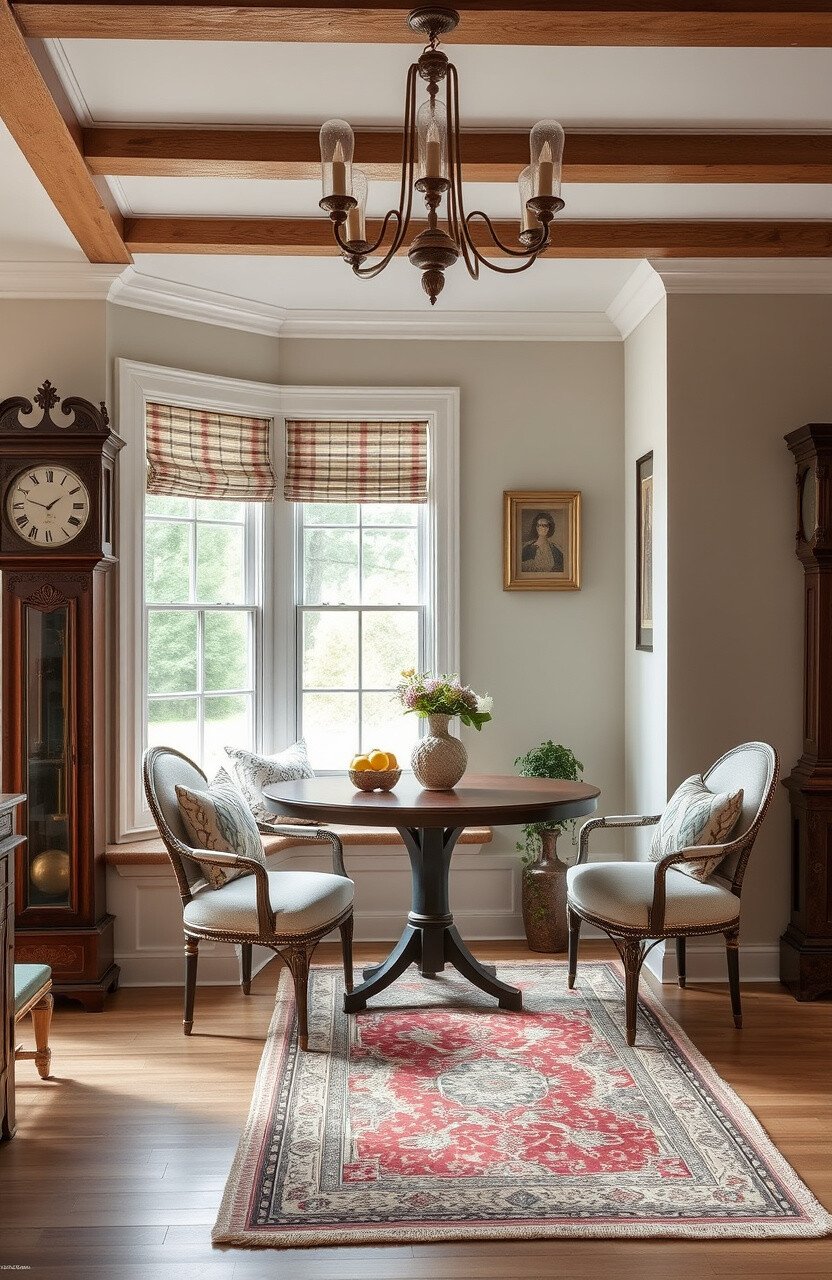 Consider adding a grandfather clock for authenticity. A soft rug can enhance its timeless elegance.