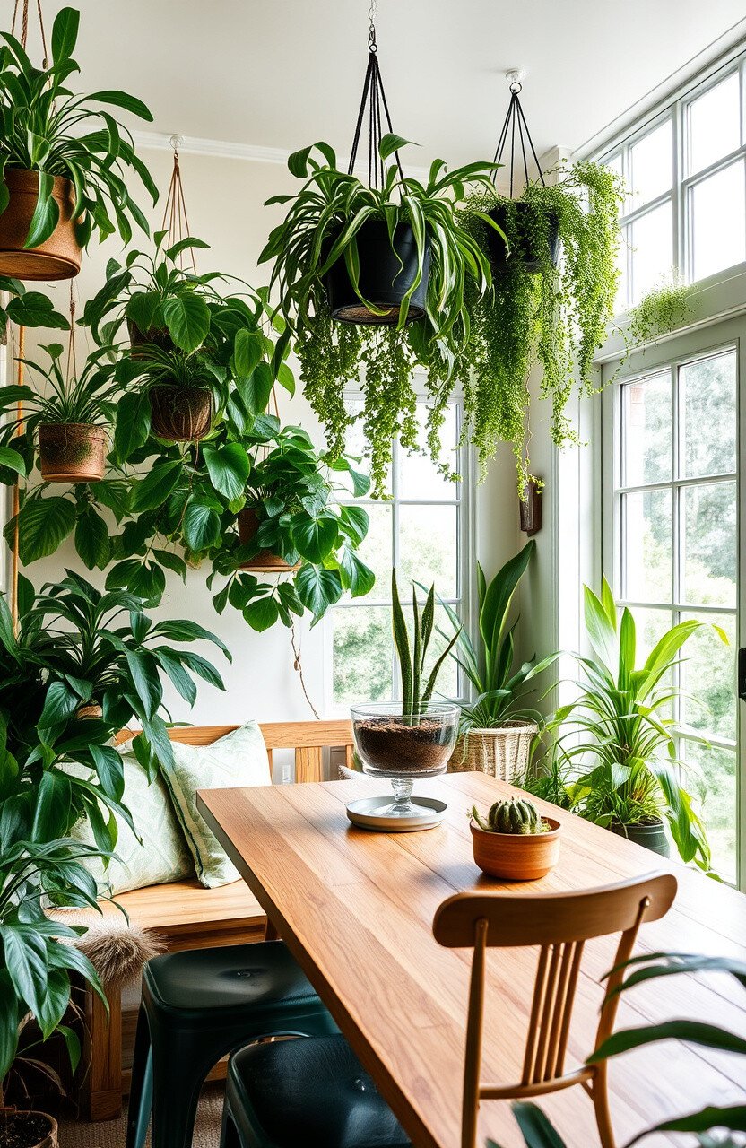 Consider adding a vertical garden for impact. A wooden table can complement the urban jungle theme.