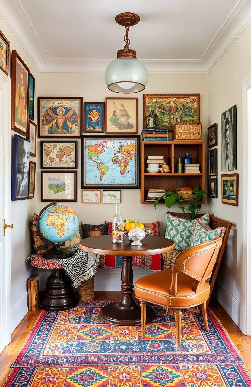 Personalize with maps or world art. It’s a style that can be achieved with thrift finds and personal items.