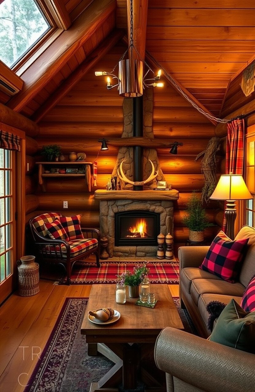 Consider adding a small fireplace for extra warmth. Soft lighting can enhance the cabin feel.