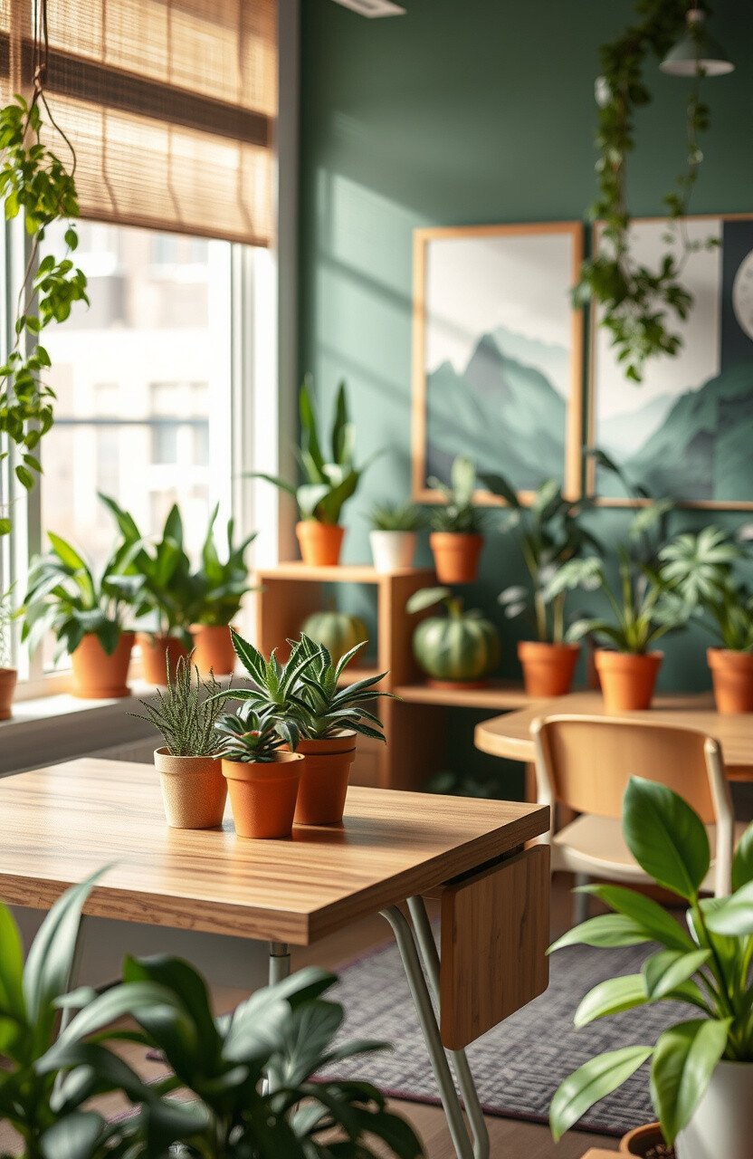 Choose low-maintenance plants like succulents. Add nature-themed posters or decals.