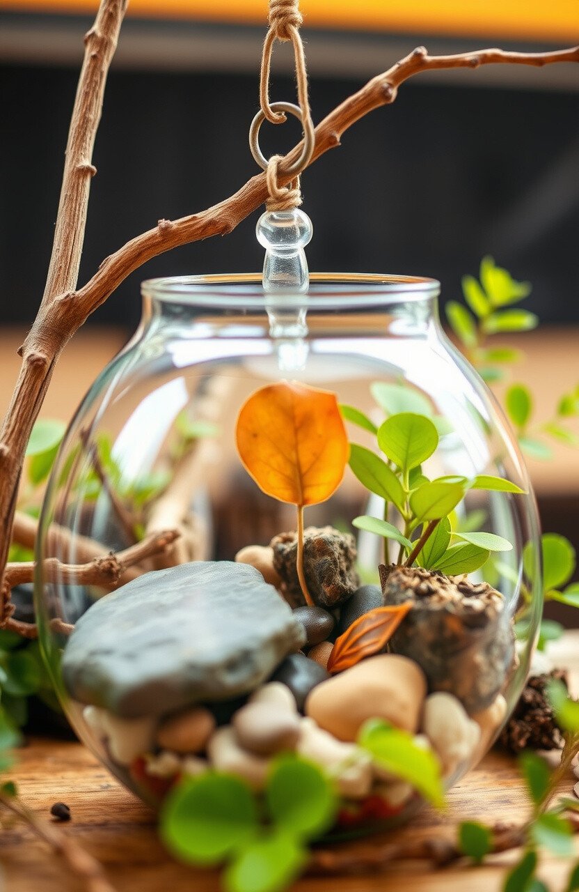 Use branches, rocks, and leaves. Create a nature display or terrarium.