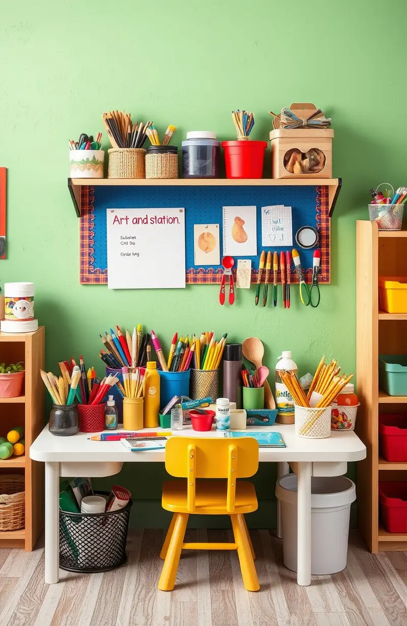 An art station filled with supplies encourages creativity and self-expression. It’s a colorful corner for budding artists.
