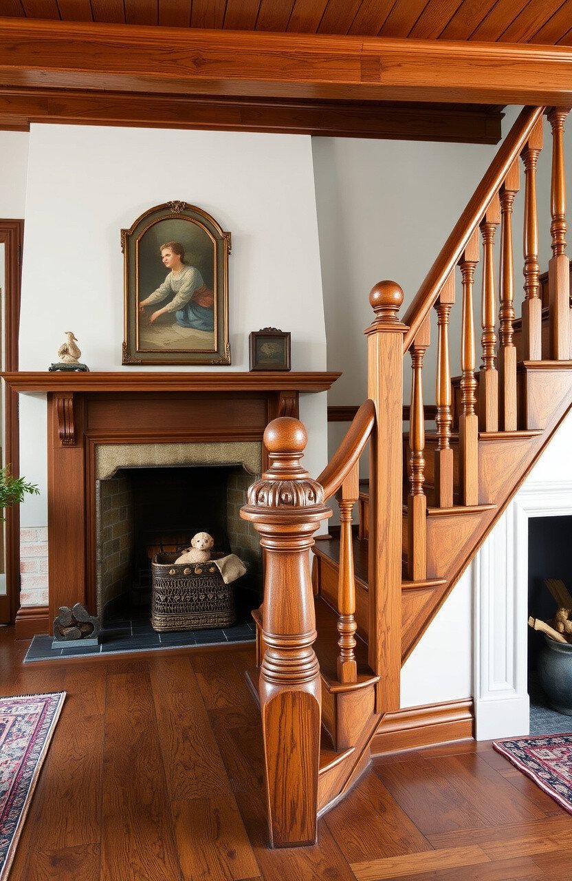 Incorporate antique wood finishes and decorative balusters for authenticity. A few vintage accessories complete the look.