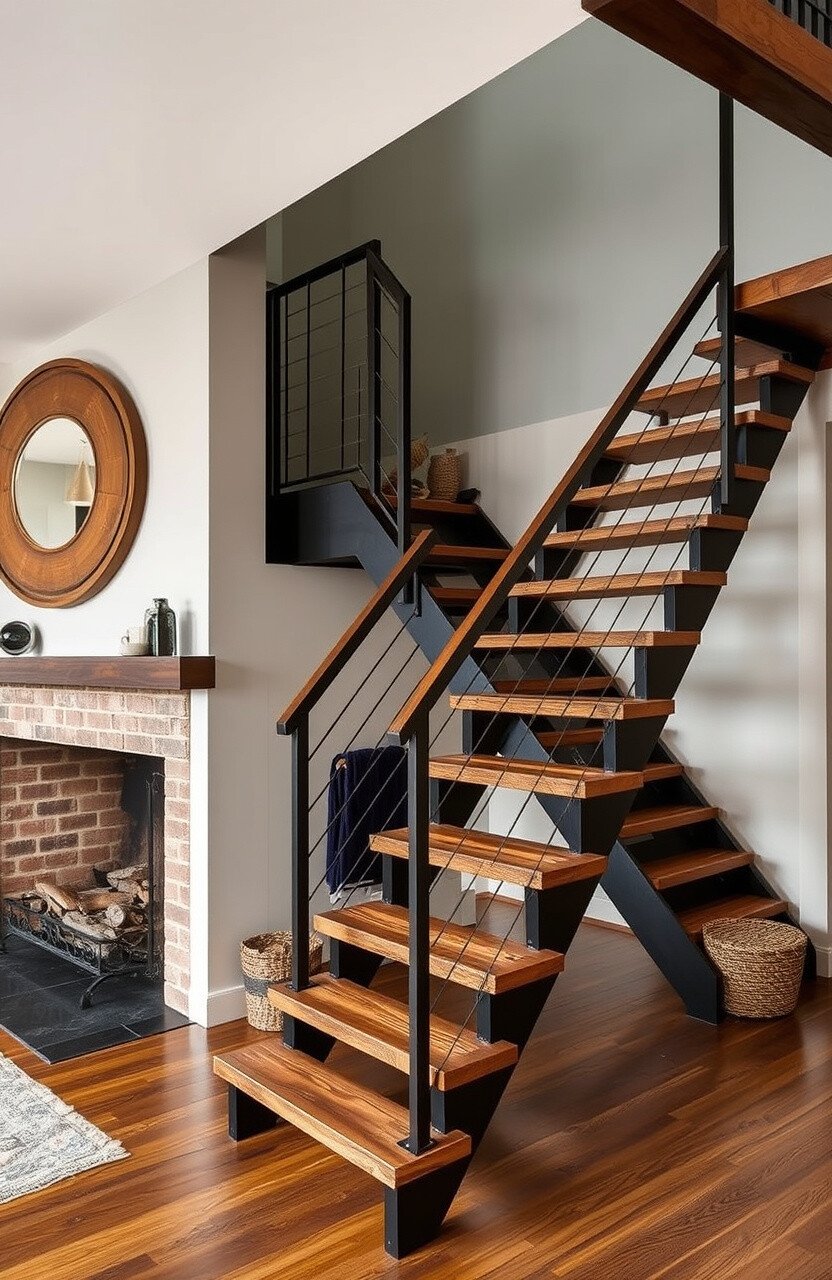 Opt for a dark stain with metal accents for contrast. A minimalist handrail completes the look.