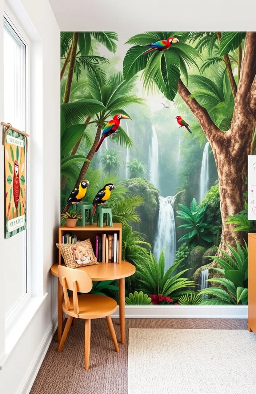 Paint or stick a jungle-themed mural on one wall. Imagine giant trees, colorful birds, and hidden waterfalls.