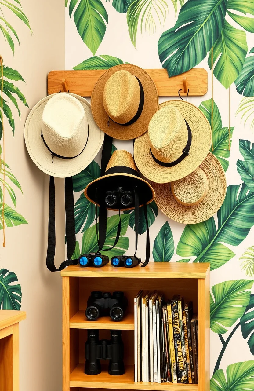 Hang hats on hooks for easy access. Display binoculars on shelves.