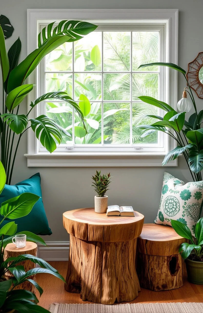 Use small tree stump tables for a natural look. They’re perfect for holding books or a cup of tea.