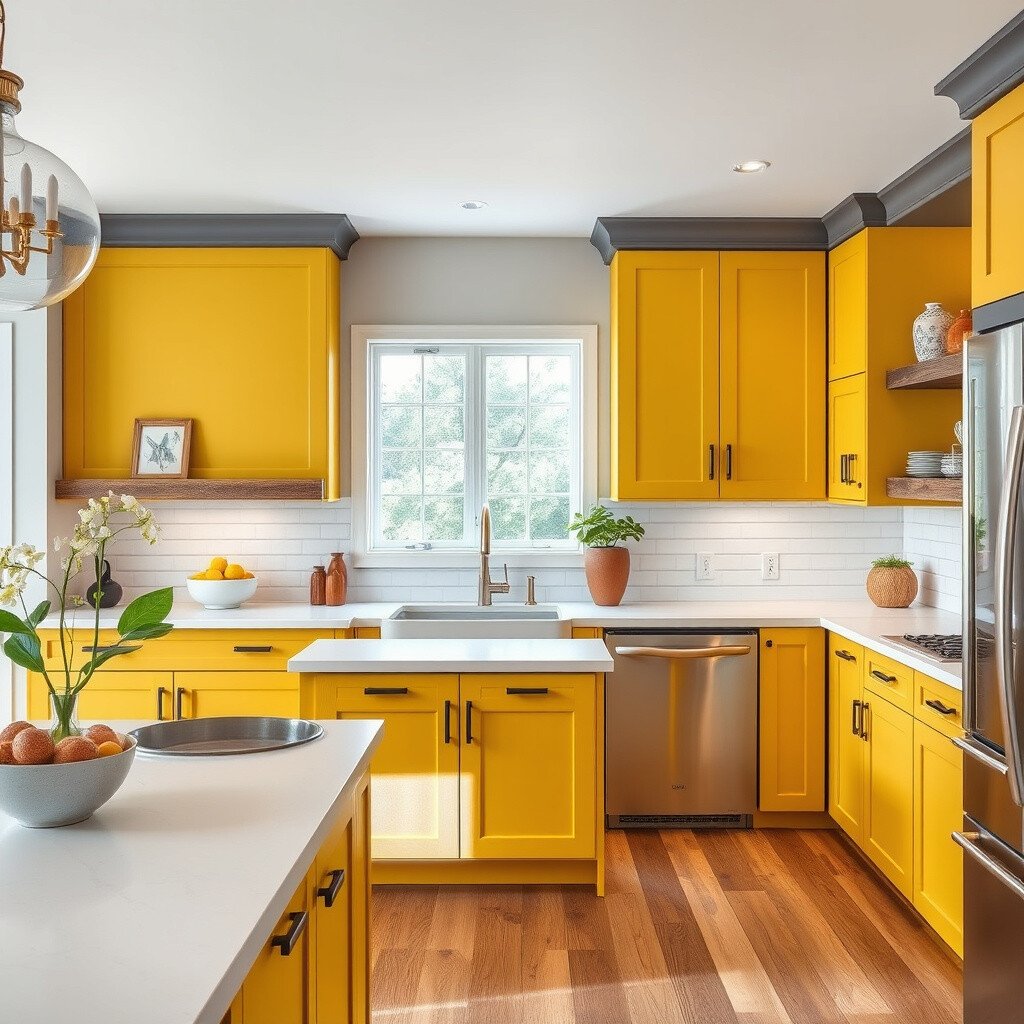 This scheme is great for those who love a cheerful, welcoming space. Mustard yellow is unique and trendy, making your kitchen stand out. Consider adding rustic wooden shelves for an eclectic touch.