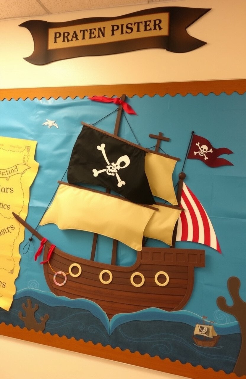 Design a board based around the adventurous life of pirates. Include pirate ships, treasure maps, and the iconic Jolly Roger flag.