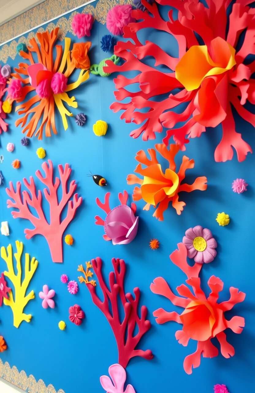 Create a vivid coral reef bursting with color. Use bright construction paper to craft corals and sea anemones. Add textures with tissue paper and felt for a 3D effect.