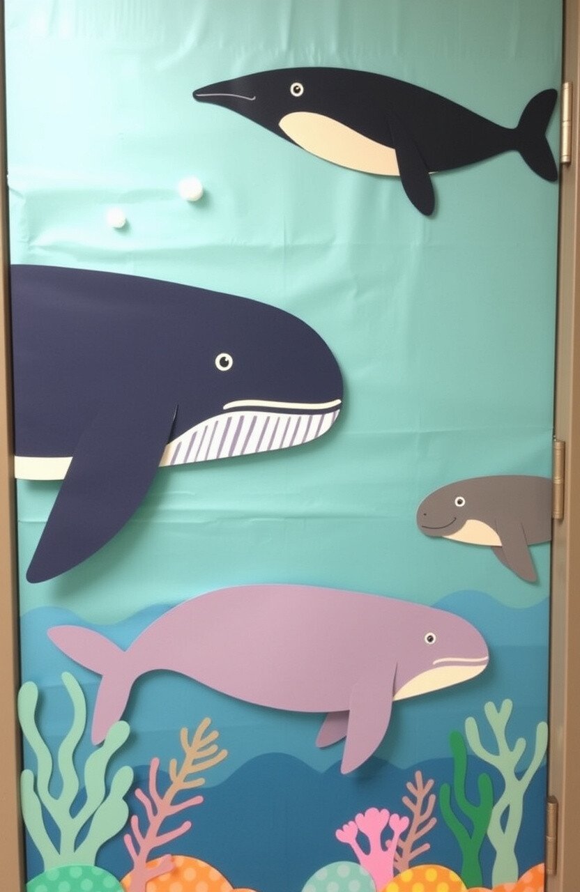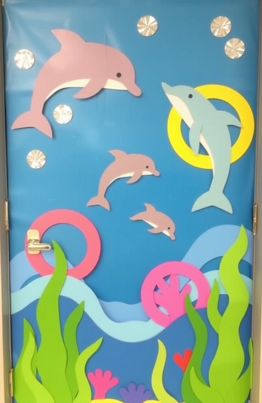 This cheerful design can lift spirits and create a joyful atmosphere. It highlights the joyful interactions within the ocean’s ecosystem. Include student-made dolphin drawings to personalize it.
