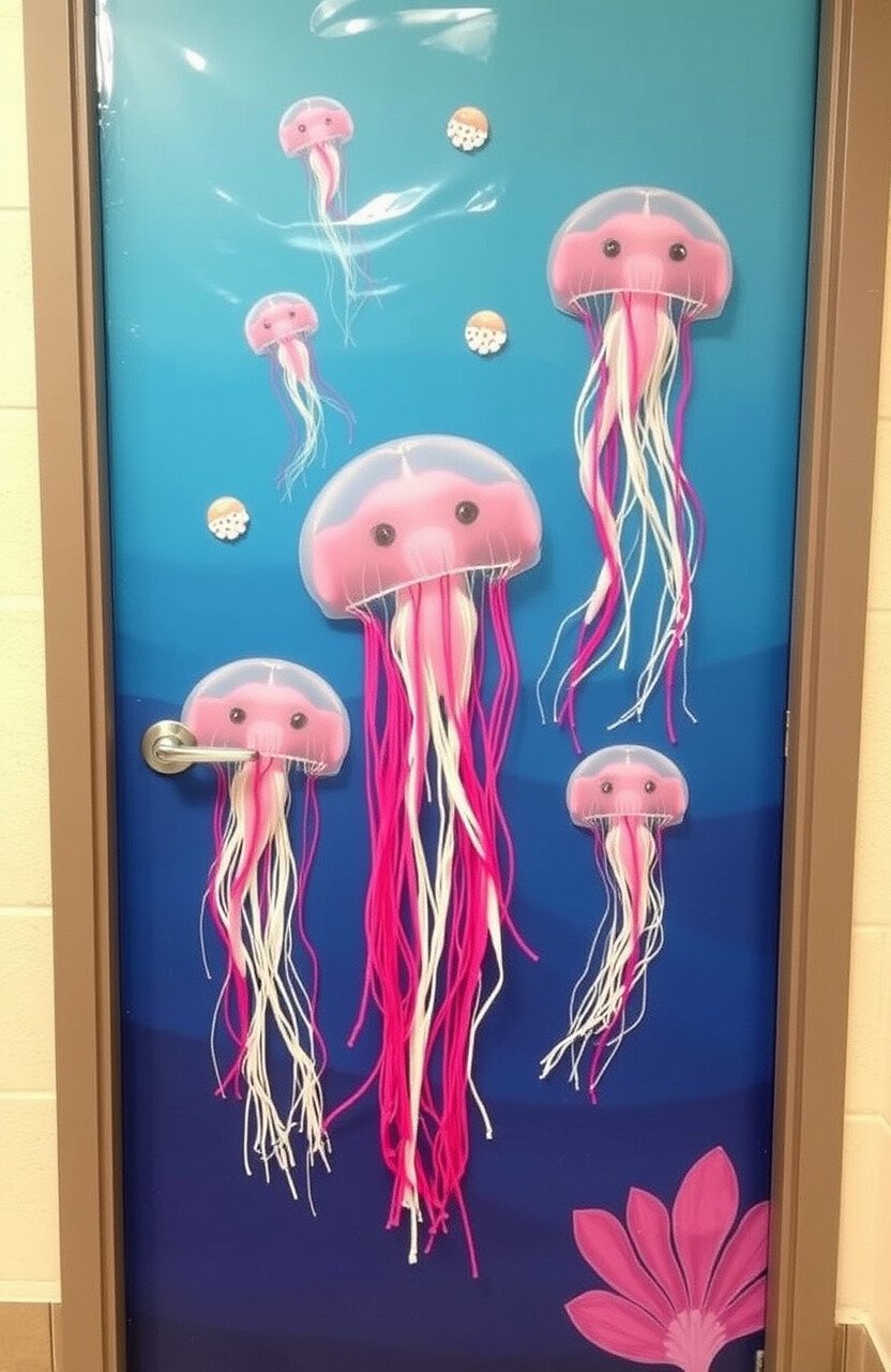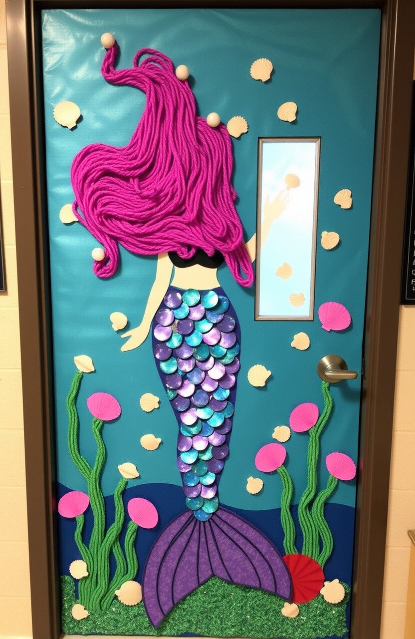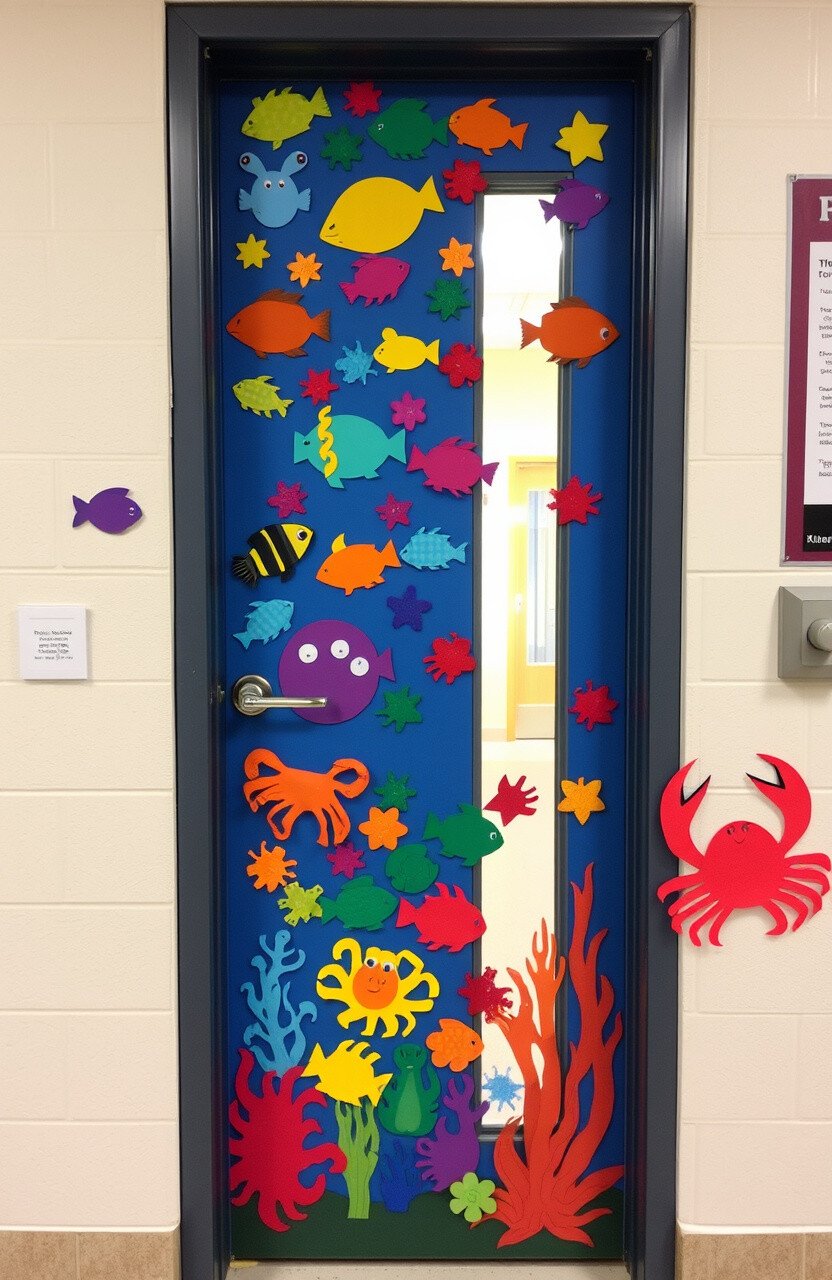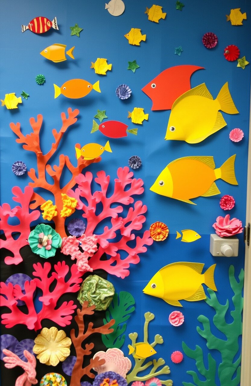Picture your classroom door transformed into a vibrant coral reef. Use colorful construction paper and fabric to create corals, sea anemones, and little fish darting in and out. The bright colors will catch the eye of anyone passing by.