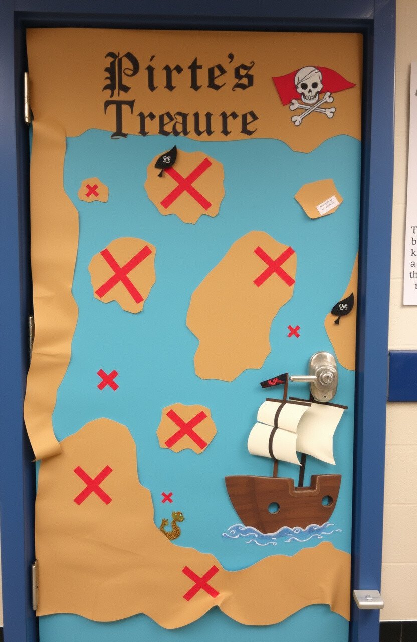 Turn your door into a pirate’s treasure map with hidden islands and X marks the spot. Use brown paper for the map and red for the X. Add pirate ships and sea creatures for fun.