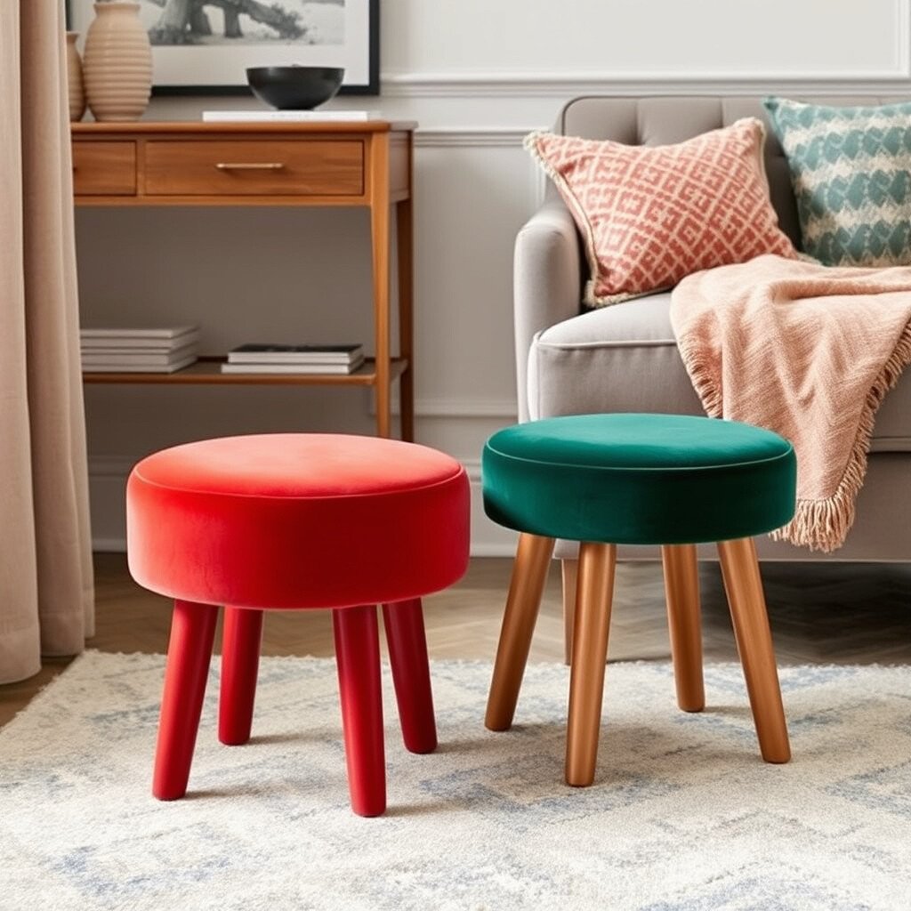 A velvet pouf is a versatile piece that can be used as a footrest or extra seating. It’s small but makes a big style impact.
