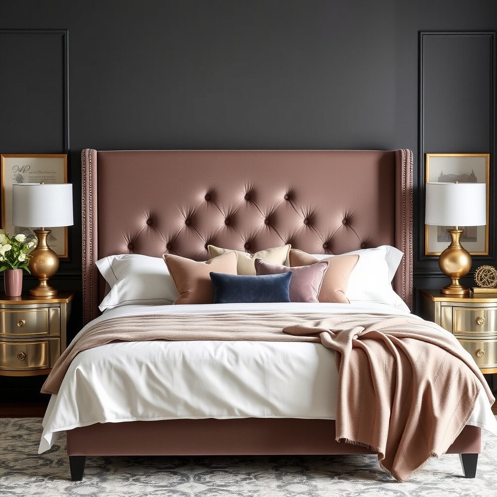Velvet headboards are soft to lean against while reading or watching TV in bed. They’re available in tufted or plain designs, adding texture and depth to your room.