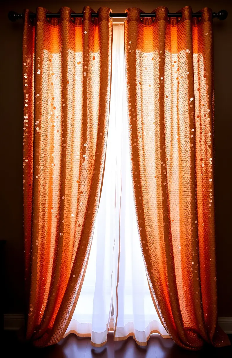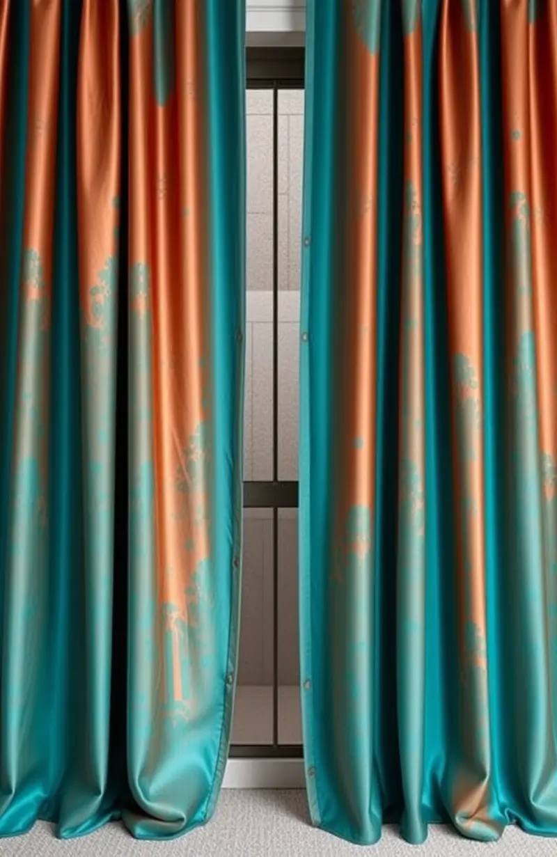 Copper and teal curtains offer a rich and modern vibe. The combination of colors is bold and stylish.