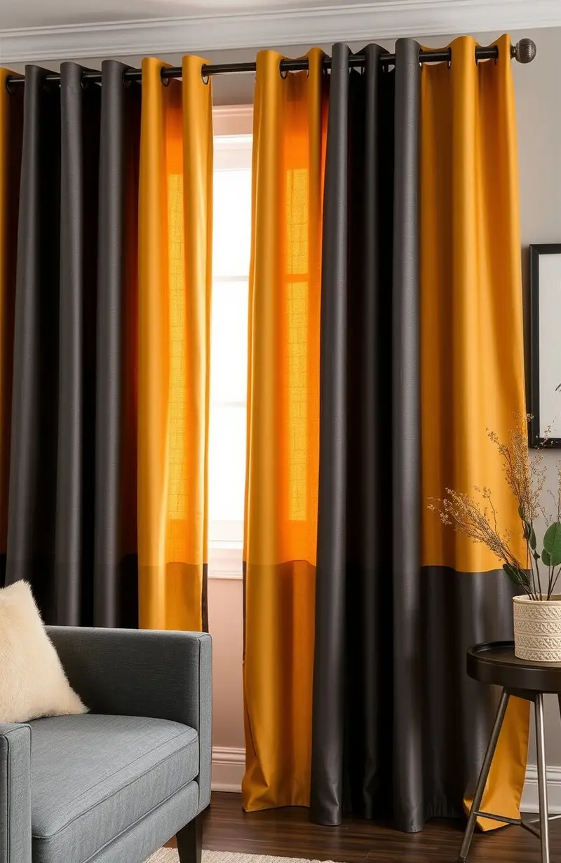 Honey and charcoal curtains offer a warm and modern vibe. The combination of colors is both stylish and inviting.