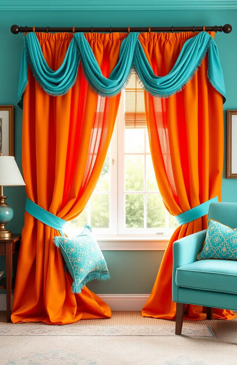 Tangerine and turquoise curtains offer a lively and energizing vibe. The combination of colors is bold and cheerful.
