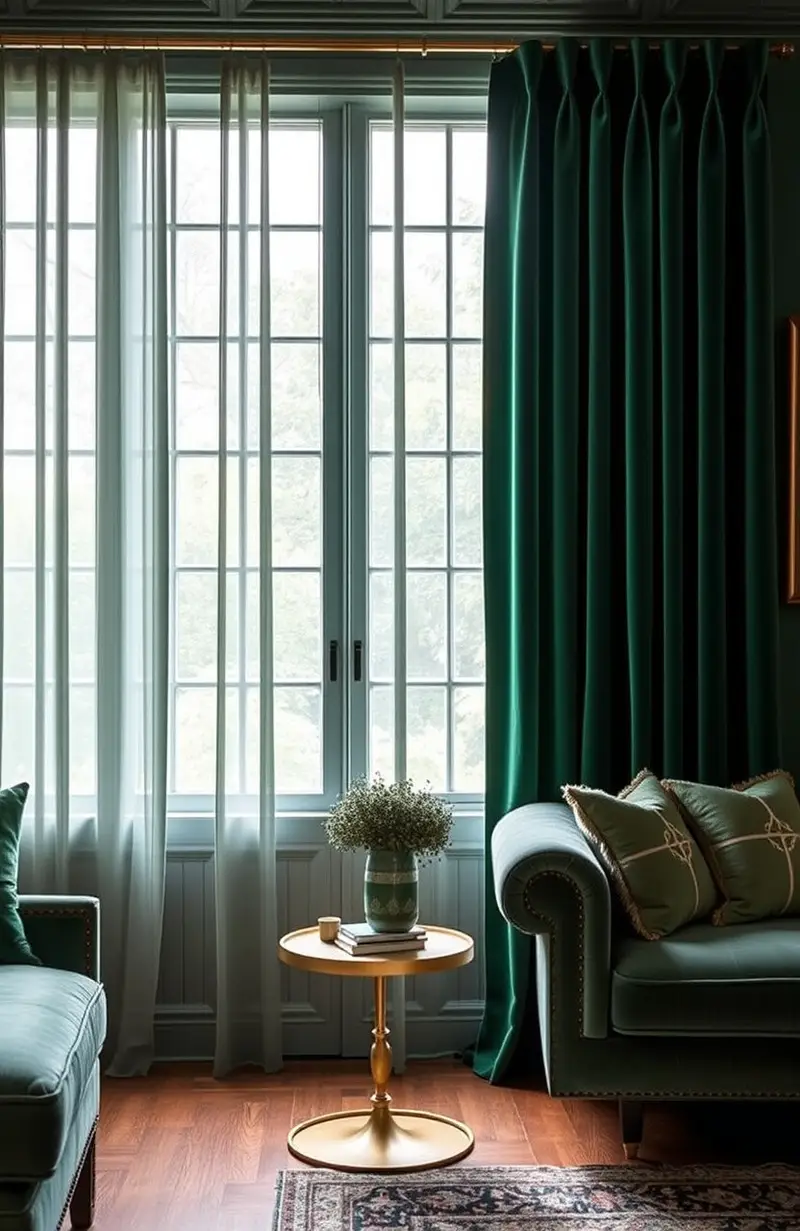 Emerald green velvet curtains add a touch of royalty and luxury. The deep green is rich and lush, perfect for a dramatic effect.