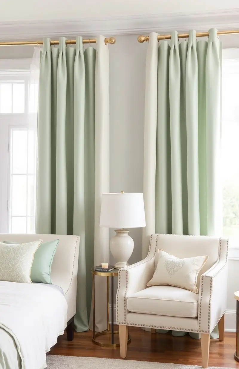 Jade and ivory curtains offer a serene and sophisticated feel. The combination of colors is elegant and fresh.