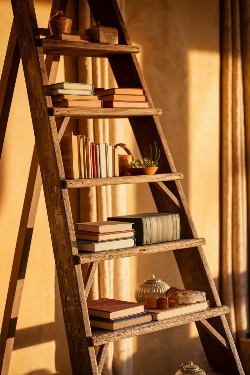 Layered ladder shelves create a beautiful display without taking up much space. They can hold a variety of items, making them both functional and stylish.
